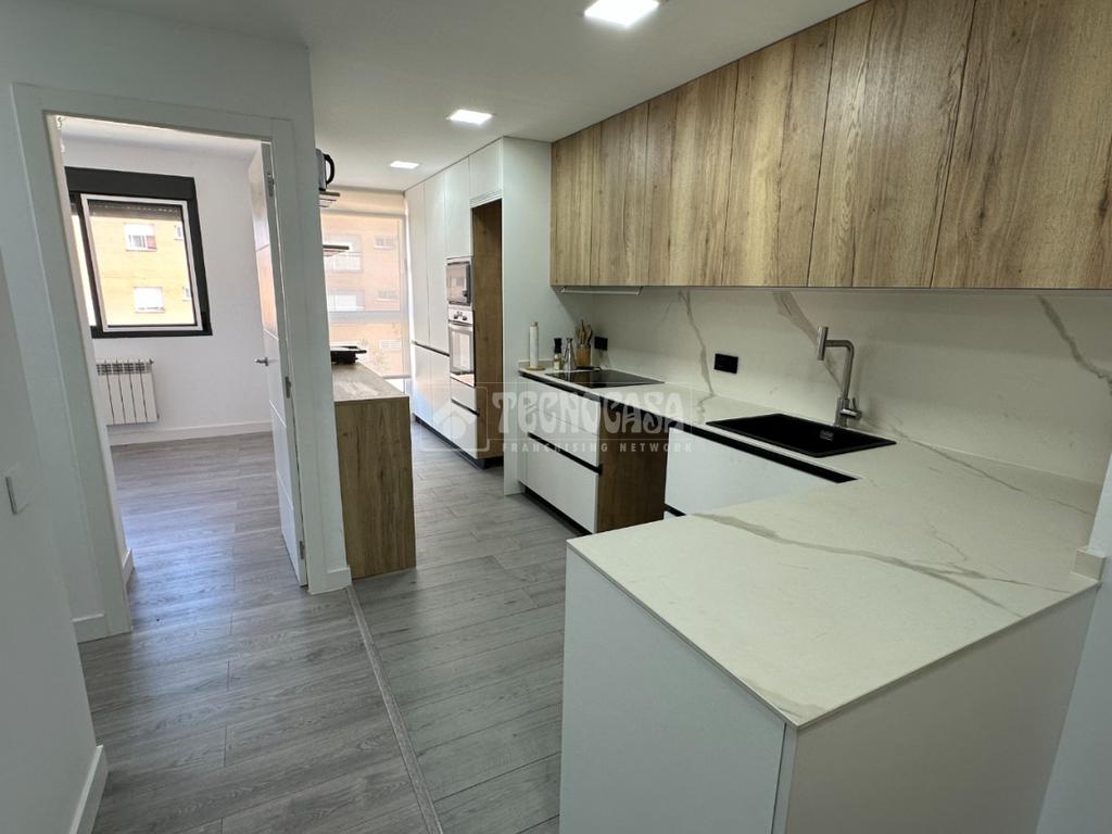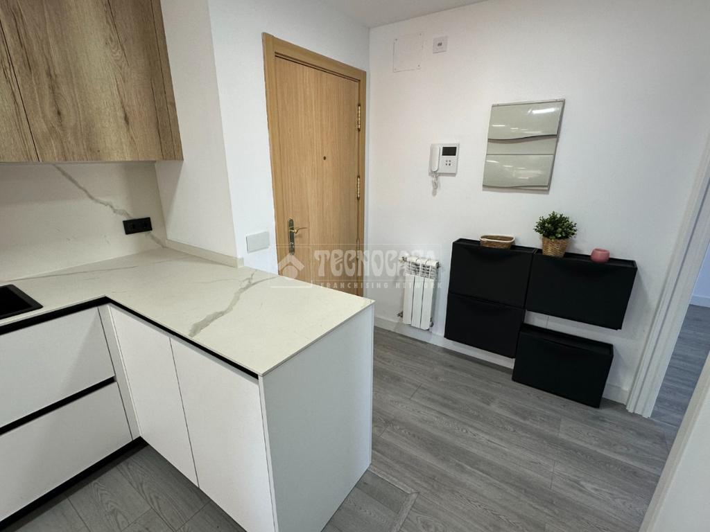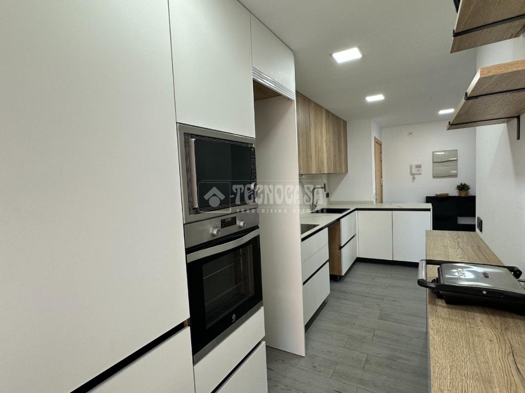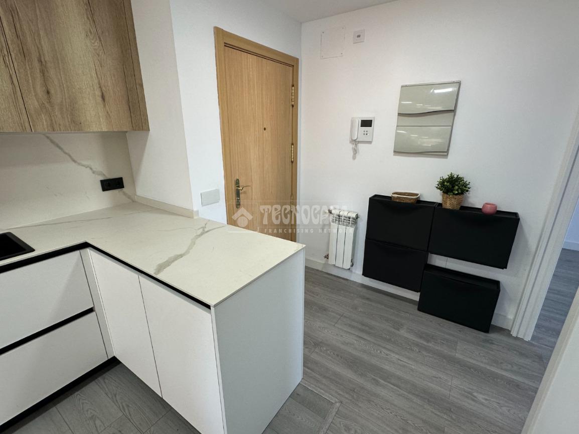 Al entrar encontramos un hall que da paso a una cocina moderna en línea con península, equipada con muebles panelados, electrodomésticos integrados, encimera resistente a rayaduras y extractor oculto. Se ha ganado amplitud incorporando la terraza tendedero, que aporta luz natural gracias a un gran ventanal.