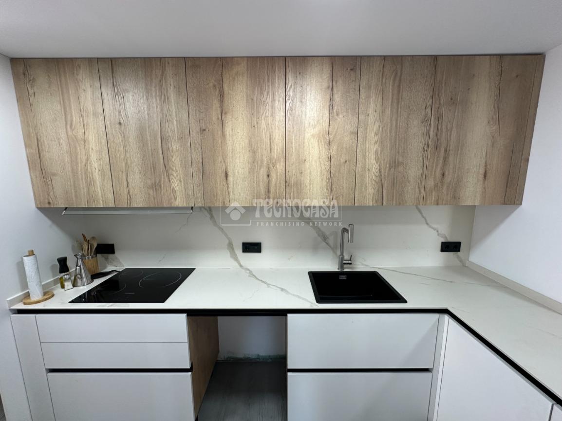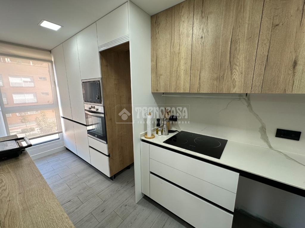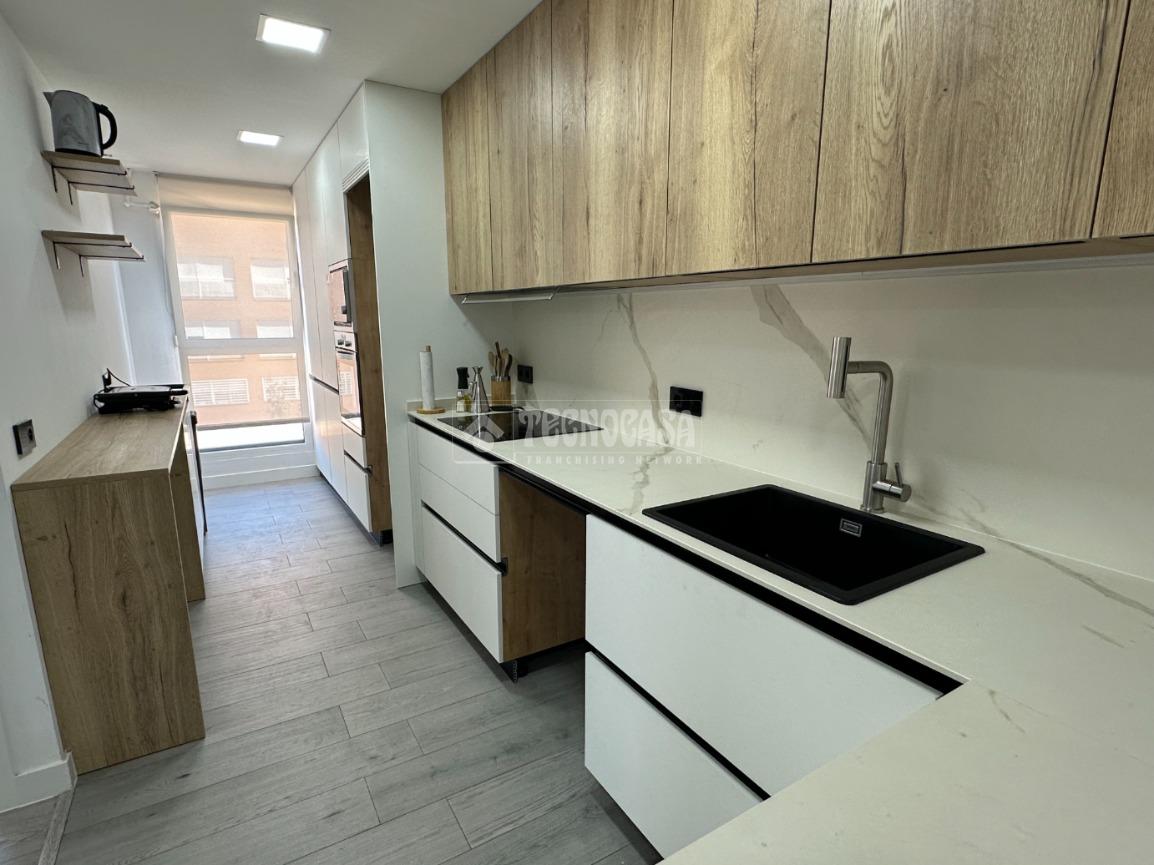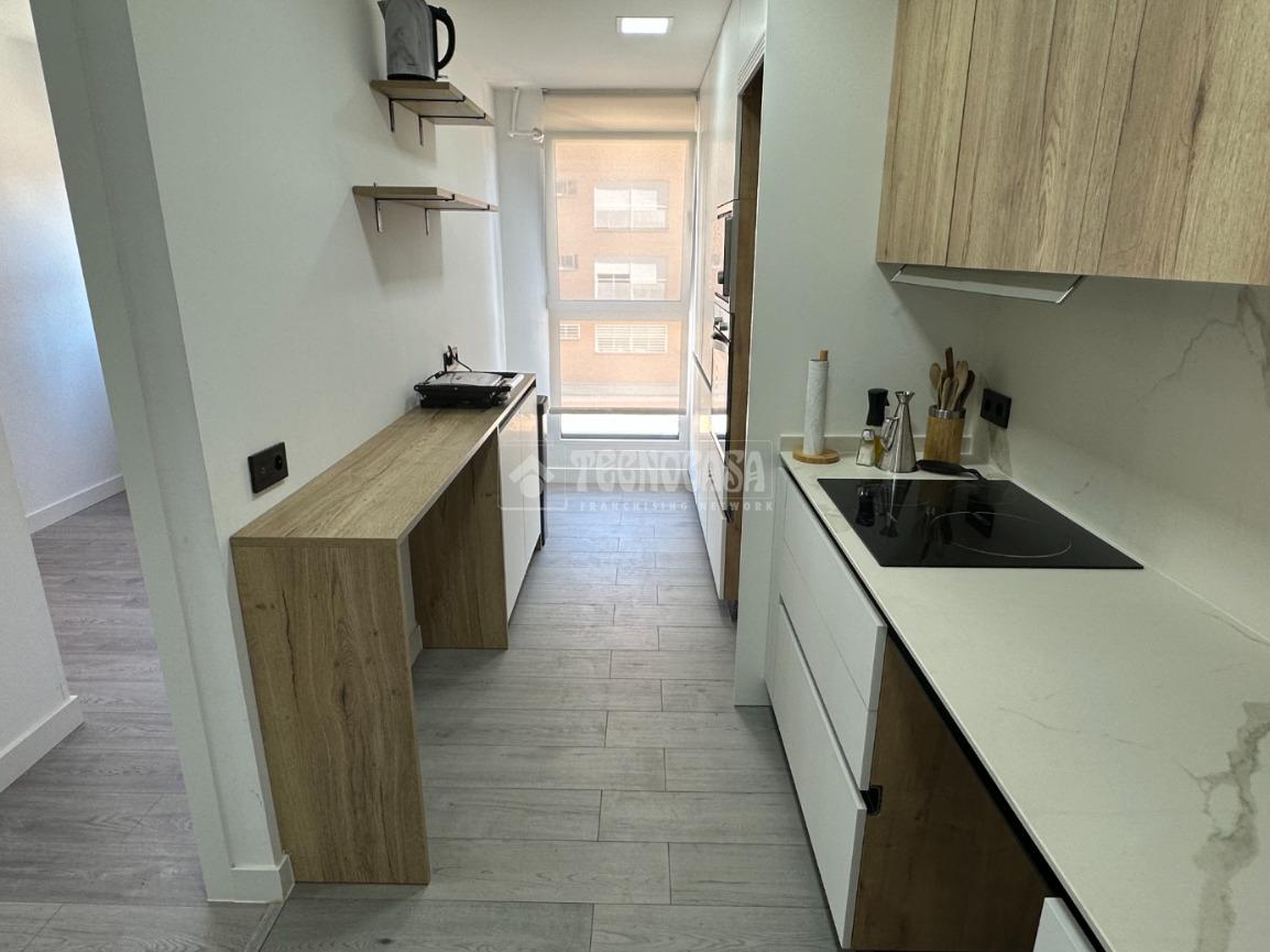 Al entrar encontramos un hall que da paso a una cocina moderna en línea con península, equipada con muebles panelados, electrodomésticos integrados, encimera resistente a rayaduras y extractor oculto. Se ha ganado amplitud incorporando la terraza tendedero, que aporta luz natural gracias a un gran ventanal.